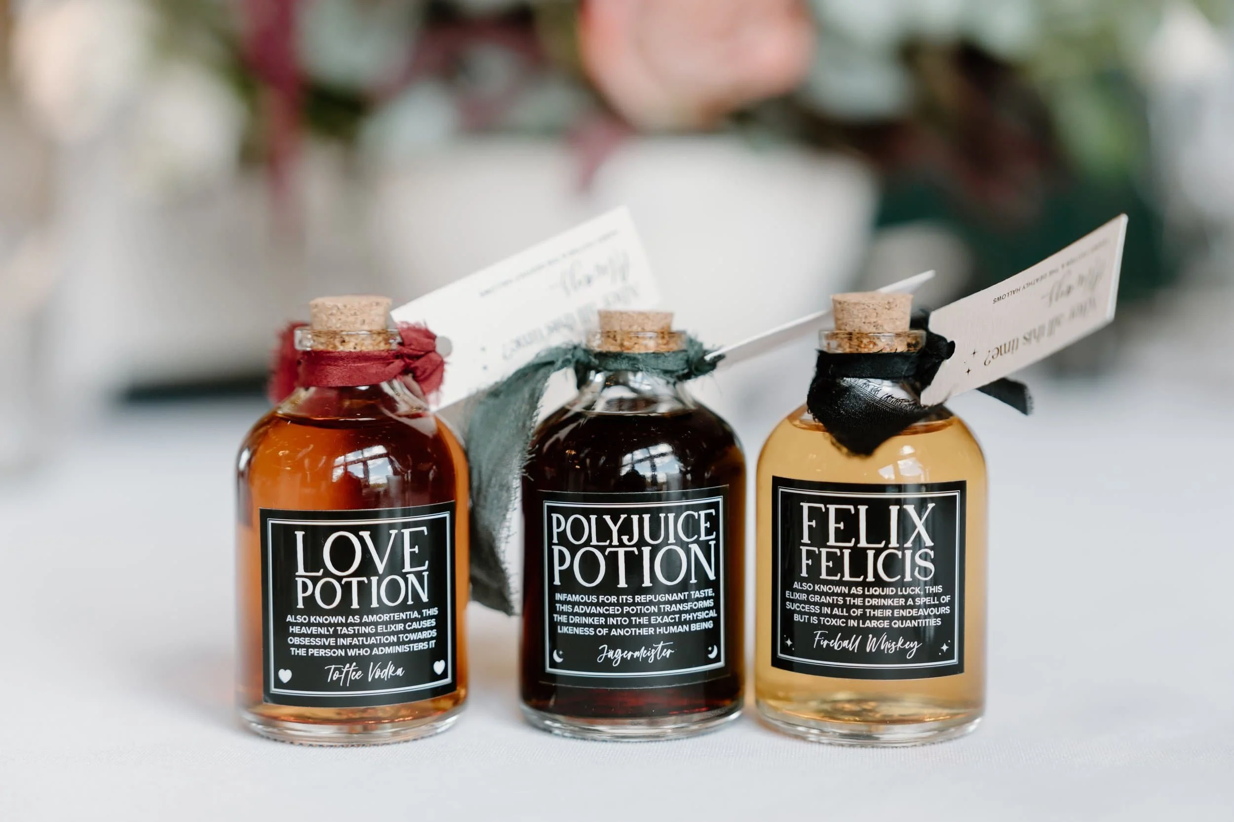 For the wedding breakfast tables, I created little potion bottle favours for each guest, filled with toffee vodka, Fireball, and Jägermeister. I also designed a custom crossword puzzle with trivia questions about us and included a “draw the bride and groom” box on the back. The results? Some very questionable (but hilarious) portraits! These added such a fun, interactive element to the tables, keeping guests entertained and sparking conversations while they waited for their food.